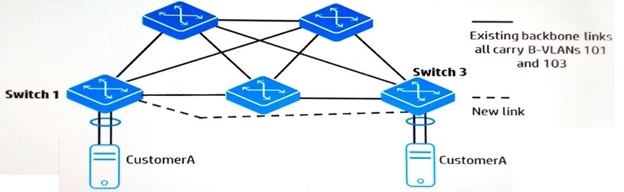 The switches in the exhibit are using SPBM. An administrator wants to send CustomerA traffic directly over the new link, shown by the dotted line in the exhibit,as a premium service for that customer. The existing links will be used for backup. The new link is reserved for CustomerA traffic.