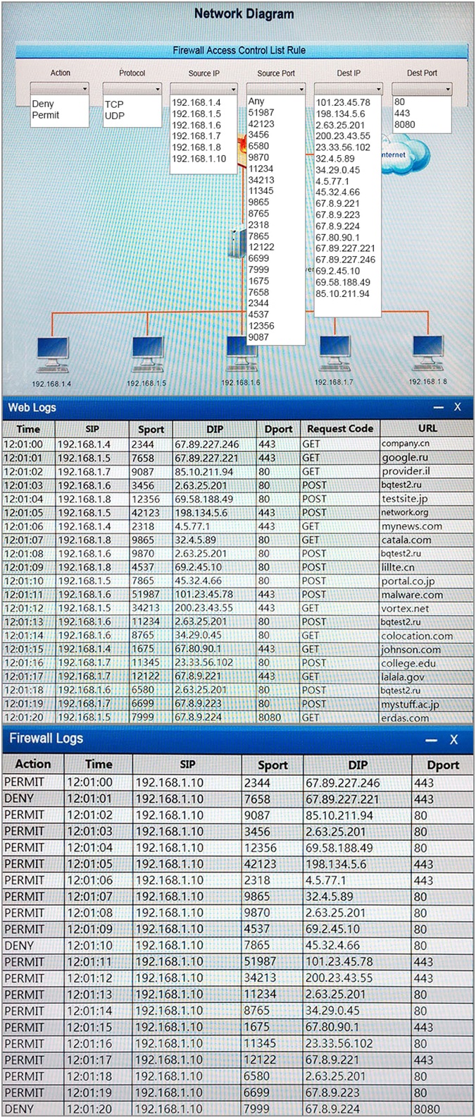 A security analyst suspects that a workstation may be beaconing to a command and control server. You must inspect the logs from the company’s web proxy server and the firewall to determine the best course of action to take in order to neutralize the threat with minimum impact to the organization.