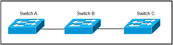 B. Switch B is configured with an access port to Switch A, while Switch C is configured with a trunk port to Switch B.