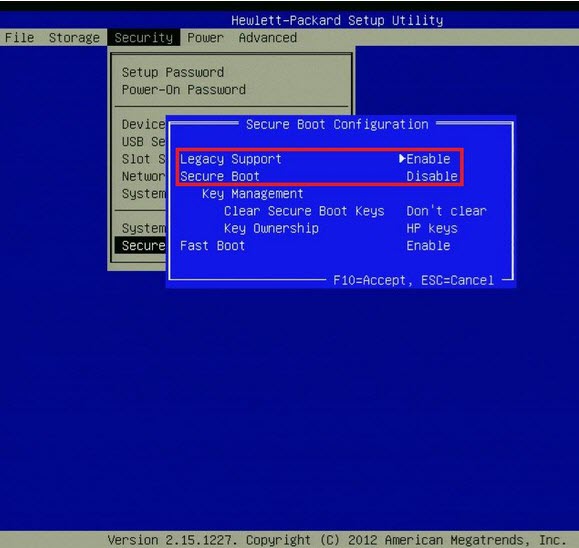 - Once you have found the Secure Boot or UEFI Boot choice, disable it by highlight it, pressing Enter, pressing the Down Arrow key and pressing Enter once more.